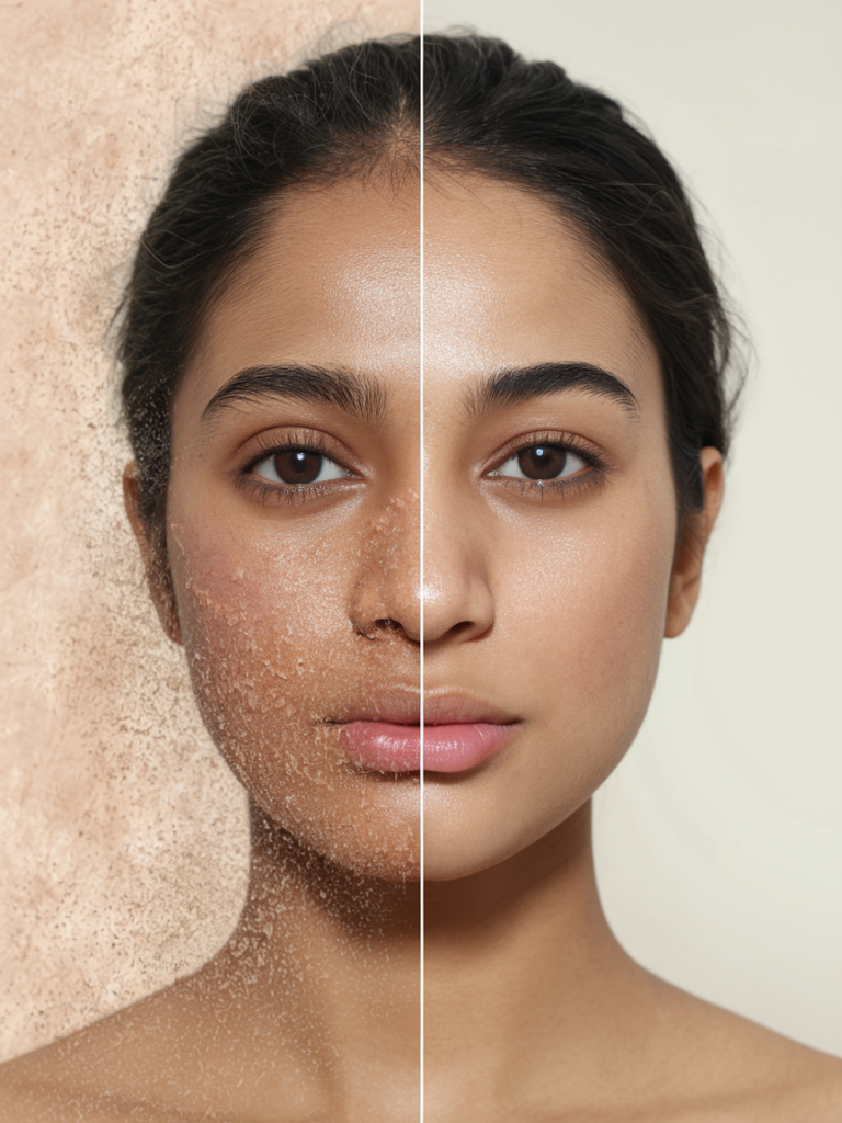 Dry, flaky skin with uneven texture and redness. Makeup application can be patchy due to dryness.
